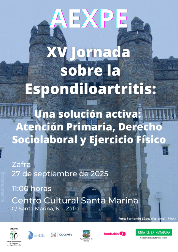 Con motivo de la celebración del Día Nacional de la Espondilitis, hemos organizado las XV JORNADAS sobre la Espondiloartritis en ZAFRA, en donde distintos profesionales nos informarán sobre la enfermedad y sus consecuencias. Estas jornadas las venimos realizando por las distintas áreas de salud de Extremadura y este es el motivo de haberla localizado en la ciudad de Zafra.